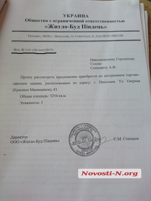 И только на следующий день после того, как три управления горисполкома уже вовсю занимались приобретением недостроя (культуры, коммунальной собственности и финансов), «проснулся» владелец объекта. Предприятие ООО «ЖитлоБудПивдень» в своем обращении к городскому голове Александру Сенкевичу от 16 мая 2017 года просит рассмотреть предложение о приобретении недостроенного торгово-офисного здания по ул. Озерной. При этом ни цена, ни конкретные технические характеристики, ни даже документы, подтверждающие право собственности на сооружение, в предложении не указаны.