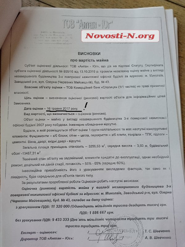 В документе подтверждается, что, согласно проведенной оценке стоимости недостроя, его собственником значится банк «Столица», при этом продавало объект некое ООО «ЖитлоБудПивдень» — именно ему были перечислены 11 с лишним миллионов. То есть, хозяин один, а деньги перечислили совсем другому и какое отношение этот другой имеет к купленному объекту — не известно. Однако, данное несоответствие управление по борьбе с коррупцией это не напрягает.
