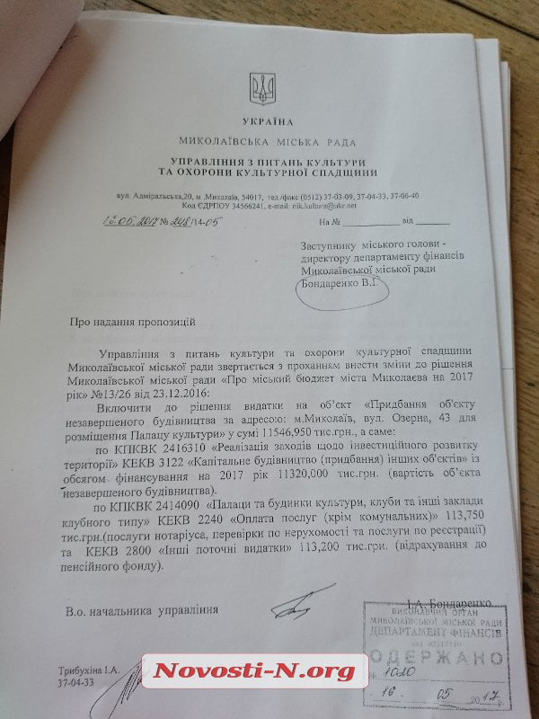 Тем не менее, процесс покупки уже был запущен, и второе обращение Бондаренко от 15 мая полетело к начальнику управления коммунальной собственности Юрию Гавришу. Вот спрашивается: зачем? Ведь год назад предыдущий начальник управления уже написал, что вопрос не в компетенции данной структуры. И в этом случае все делалось прямо-таки с невероятной скоростью: в тот же день Гавриш направил письмо в департамент финансов, в котором просит рассмотреть возможность приобретения данного недостроя. При этом — ВНИМАНИЕ! – в его письме указана стоимость — 11,4 млн грн!