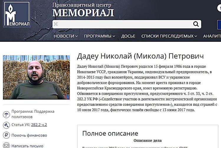 «Правозащитный центр «Мемориал» изучил материалы уголовного дела и пришел к выводу, что деятельность «Правого сектора» запрещена ВС РФ на территории Российской Федерации, тогда как Николай Дадеу, согласно обвинению, принимал в ней участие только на территории Украины, являясь ее гражданином. Утверждение, что деятельность «Правого сектора» на Украине направлена «на насильственное изменение основ конституционного строя и нарушение целостности Российской Федерации, подрыв безопасности государства», представляется нам надуманным, как и бездоказательное утверждение, что Дадеу нанес значимый ущерб интересам России», – пишут правозащитники.