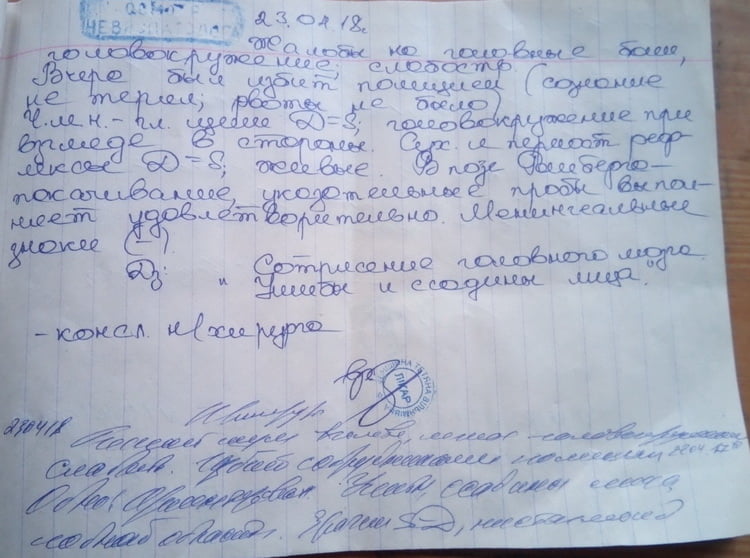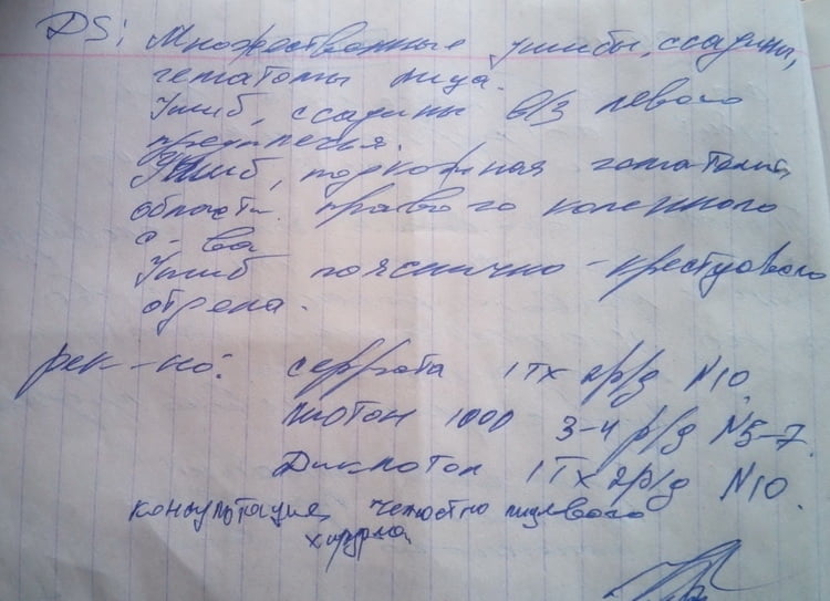 23 апреля с утра я зашел в местную прокуратуру (заявление у меня не приняли, а посоветовали поехать на ул. Новозаводскую, 1). Затем сразу пошел в больницу, а после неё, со всеми медицинскими заключениями (они были у меня с собой в пакете) приехал в Управление патрульной полиции. Там у меня приняли заявление, и я писал, что мне поставили такие-то диагнозы, но никаких документов из больницы меня показать не просили (потому что проверку должны были проводить другие люди, не те, что заявление принимали), а сказали, что меня вызовут, и тогда всё посмотрят, проверят и т. д. Однако никто меня так и не вызвал, ничего не проверил. А в ответе я прочитал, что это я им ничего не предоставил…»