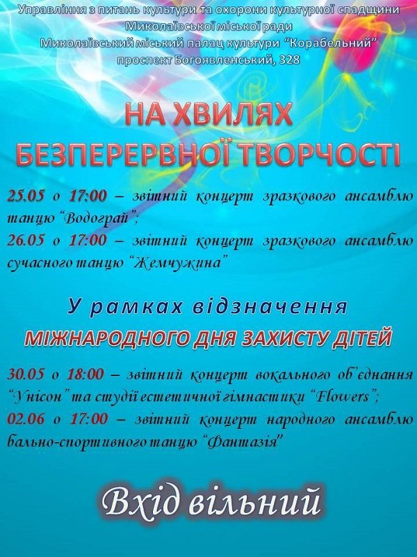 Міський палац культури «Корабельний» запрошує мешканців міста і гостей району з користю провести дозвілля та долучитися до прекрасного світу мистецтва, відвідавши звітні концерти колективів художньої самодіяльності, що відбудуться з 25 травня по 2 червня.
