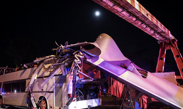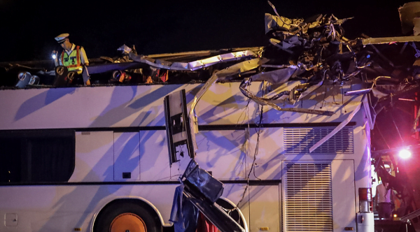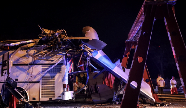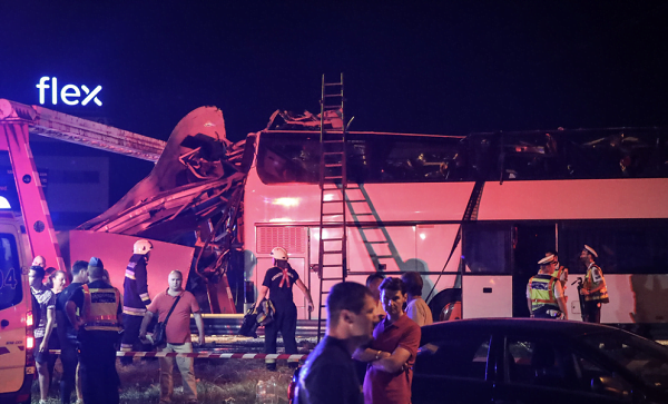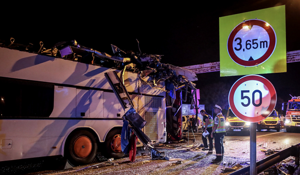Сообщается, что накануне вечером двухэтажный туристический автобус Setra из Украины на скорости врезался в 3,5 метровый ограничитель высоты. В результате аварии снесло практически весь второй этаж, на котором находились около 20 пассажиров.