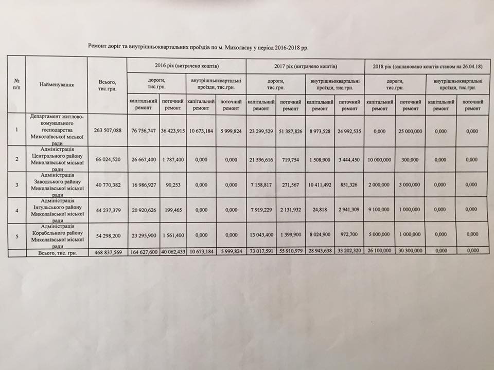 В 2016 году на капитальный и текущий ремонт автомобильных дорог было выделено из городского бюджета 204 690 045 грн. В 2017 году — 128 928 621 грн. По состоянию на 26.04.2018 год на ремонт дорог уже запланировано в бюджете 56 400 000 грн.