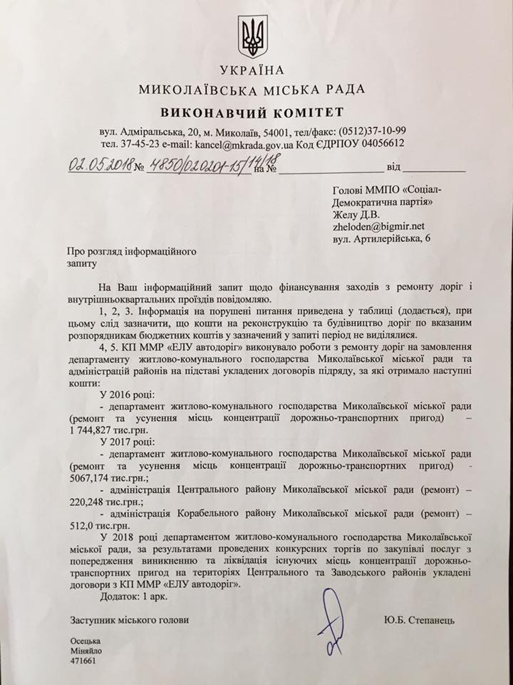 Николаевцы ежедневно ощущают на себе результаты работы мэра и его дорожного предприятия, вспоминая местную власть незлым громким матом. Водители не могут понять, за что они платят налоги, дорожный сбор, если при этом, должны ездить по разваленным, как после бомбежкам дорогам и за свои деньги ремонтировать автомобили, раскуроченные в дорожных ямах и люках. А самое страшное — это смерти на дорогах. Именно разбитые дороги, являются одной из причин высокой аварийности.