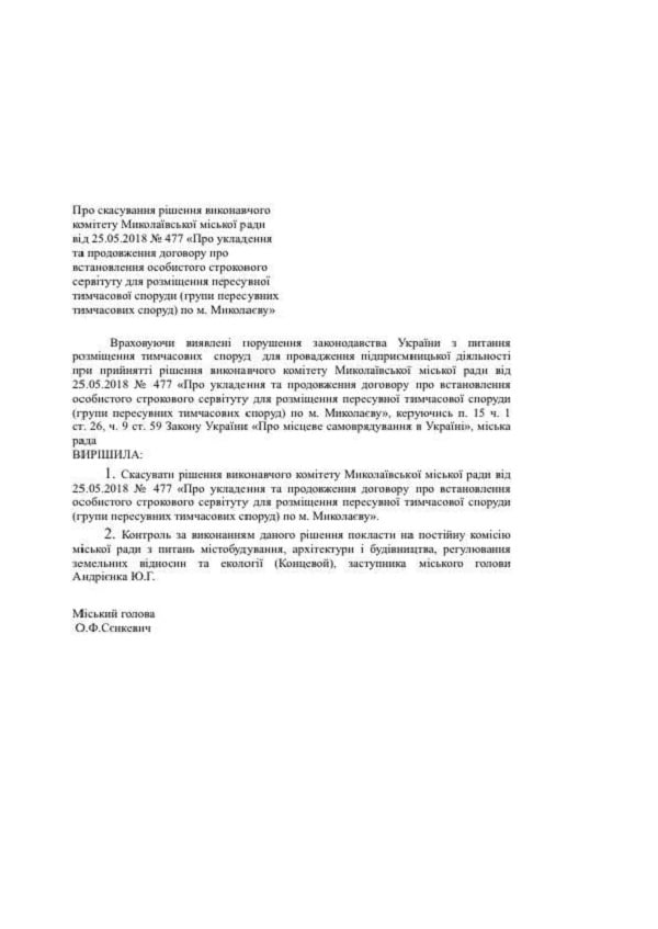 Депутат Николаевского городского совета от партии «Наш край» Владислав Ентин, представляющий Корабельный район, требует отменить решение исполкома городского совета о продлении сервитутов для размещения киосков на площади Победы.