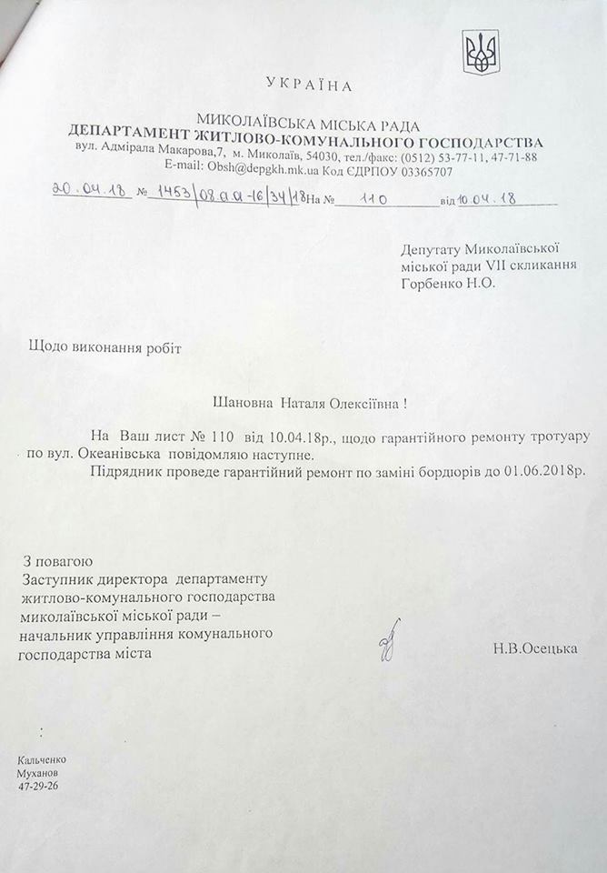 «…Весной 2018-го стало очевидно, что на одном из участков полностью разрушился бордюрный камень», — написала в соцсети facebook депутат Николаевского горсовета, представляющая один из избирательных округов в Корабельном районе и ставящая себе в заслугу ремонт данного тротуара, выполненный по заказу департамента ЖКХ, Наталья Горбенко.