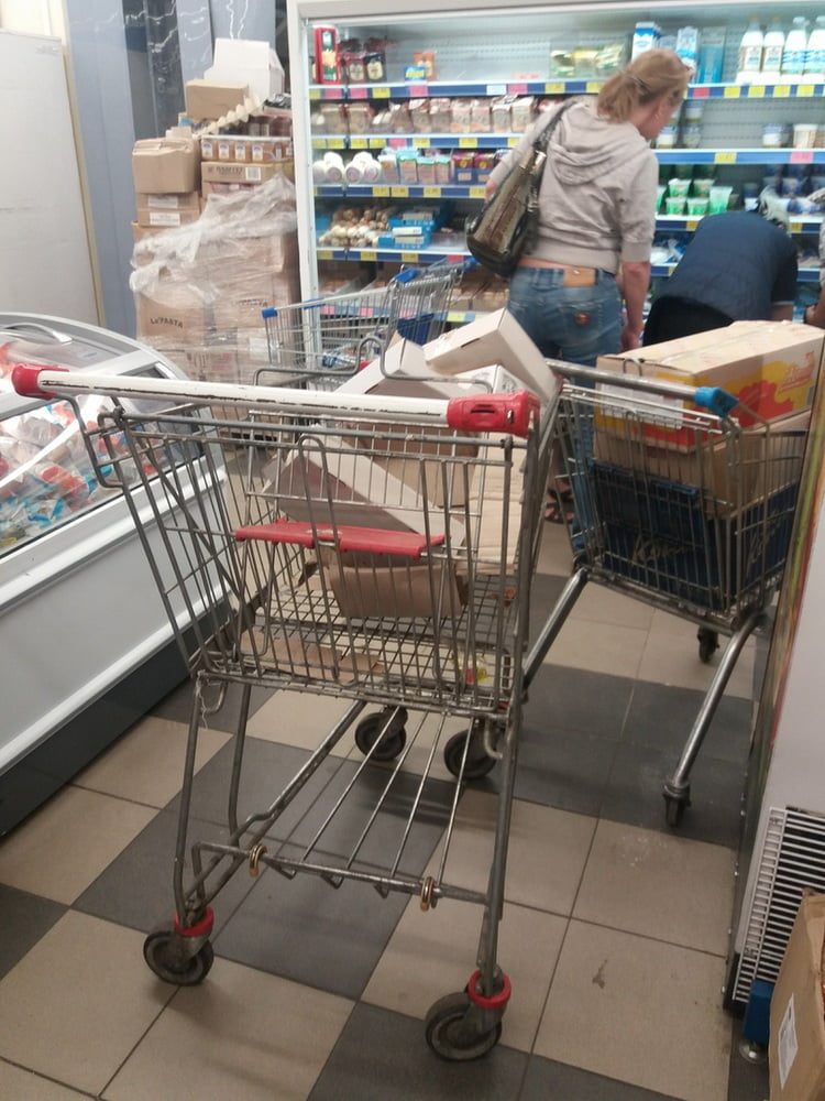 В некоторых местах даже 2 человека пройти не могут. Также по всему залу торговому стоят рабочие тележки с макулатурой, из-за которых затрудняется проход по отделам, все ходят и пихают эти рабочие тележки, чтобы хоть как-то пройти. Холодильники с холодными напитками тоже заставлены поддонами.