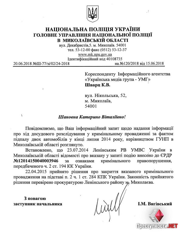 Все уголовное производства были отрыты по признакам преступления, предусмотренного частью 2 статьей 194 Уголовного кодекса Украины («Умышленное уничтожение или повреждение имущества»).
