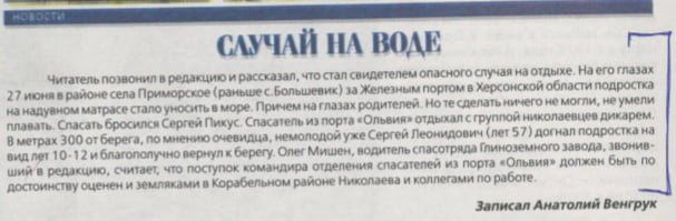 «Поступок командира отделения спасателей из порта «Ольвия» должен быть по достоинству оценен и земляками в Корабельном районе Николаева, и коллегами по работе», — считает Олег М. (водитель спасотряда НГЗ), звонивший в редакцию газеты.
