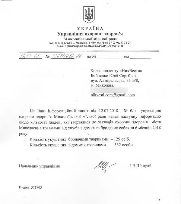 «Управление здравоохранения Николаевского городского совета предоставляет следующую информацию относительно количества людей, которые обратились в учреждения здравоохранения города Николаева с травмами от укусов бродячих собак за 6 месяцев 2018 года. Число укушенных бродячими животными – 129 человек, число укушенных знакомыми животными — 332 человека», — сказано в сообщении.