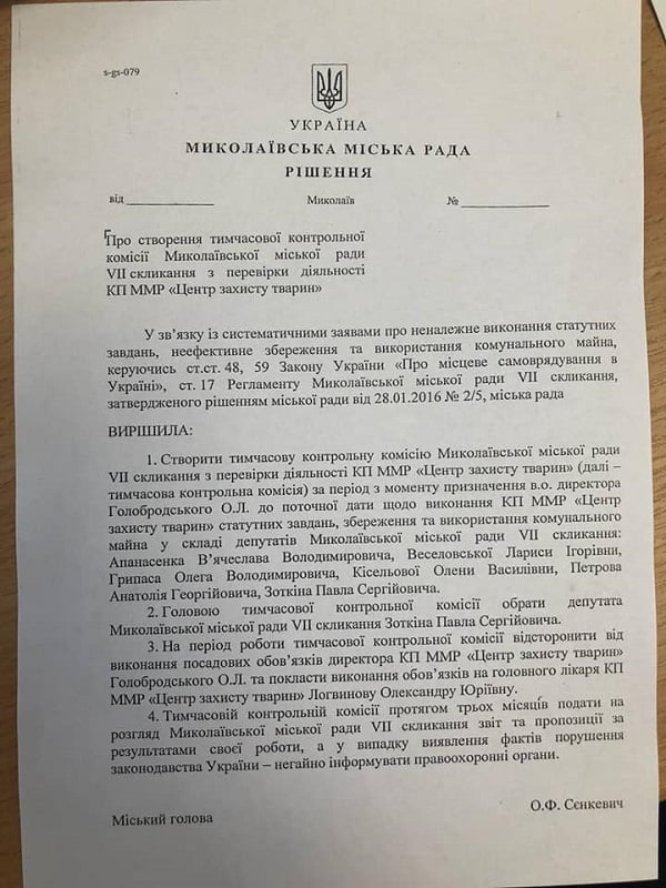 Об этом идет речь в решении о создании временной контрольной комиссии Николаевского городского совета VII созыва по проверке деятельности КП «Центр защиты животных», опубликованном на сайте мэрии.