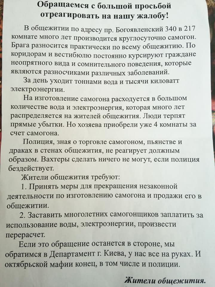 «У нас тут веде одна сімя виробництво та продаж самогону. Уже не перший рік на них немає управи, а в них розростається житлова площа! Тече вода, світло, а платять усі. Крім того, розвелося повно пияків, які зранку до ночі тут висиджують, немає де з дитиною вийти. Самогон комусь іде в прибутки, а комусь — це материнські, жіночі сльози, сімейні сварки і драки, це дитяче спустошене дитинство, голодне і обідране, бо останні копійки ідуть на пляшку… Промишляє цим кімната № 217. У них було дві кімнати (217, 218), ще одну купили (219), плюс ще одну їм виділив наш любий горісполком. Не знаю, як в них це вийшло, є свої люди там (начебто син цих «варців» працював раніше в міліції).