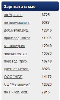 На сайте единой первичной организации профсоюза трудящихся металлургической и горнодобывающей промышленности Украины промплощадки НГЗ в июле опубликовали статистику по средней зарплате в отрасли и в Украине в общем, полученной в мае.