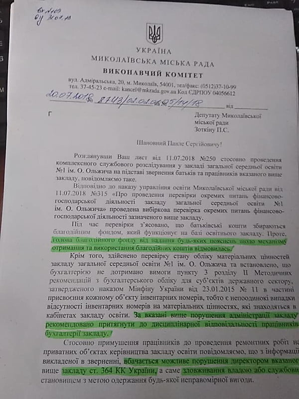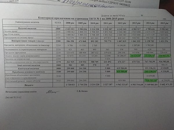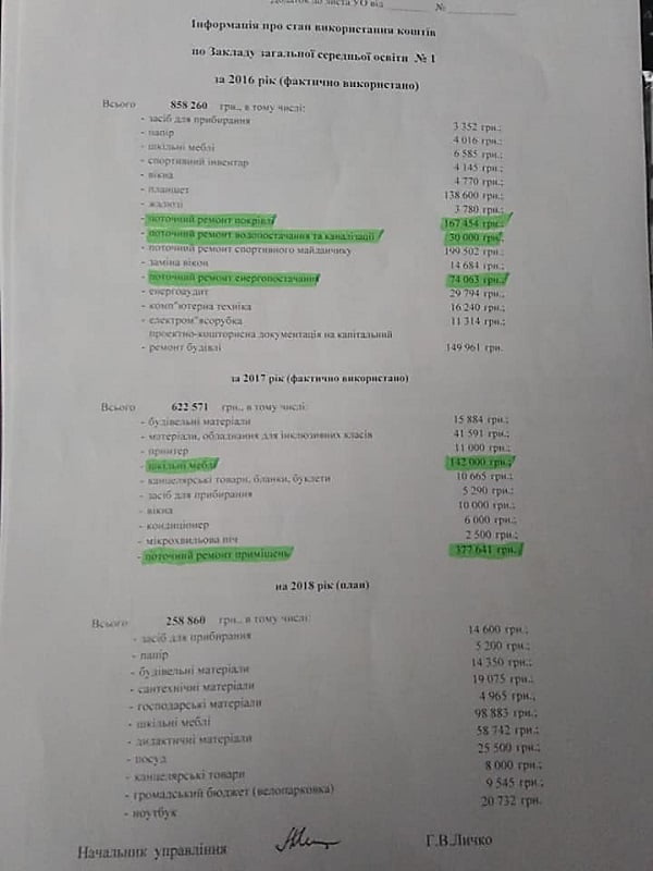 Также он опубликовал документы о финансировании школы с 2008 года. В частности, из документов видно, что за 2016 год из городского бюджета выделяли 167,45 тыс грн на ремонт кровли, на текущий ремонт водоснабжения и канализации — 30 тыс грн, на ремонт энергоснабжения более 74 тыс грн.