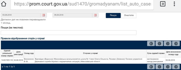 В настоящее время на официальном интернет-ресурсе Судебной власти в Украине находится информация о том, что Николаевским окружным административным судом (судьей В.В. Бионосенко) будет рассмотрено дело № 1440/1851/18 относительно применения меры реагирования по иску Главного управления ГСЧС Украины в Николаевской области к Николаевской общеобразовательной школе №1 им. Олега Ольжича: