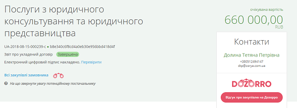 Николаевское государственное предприятия «Зоря»-«Машпроект» заключило двухнедельный договор на 660 тысяч рублей (270,5 тысяч гривен – прим.) с ООО «Техинвестэнерго» (Санкт-Петербург, Россия) по юридическому представительству интересов на территории Таможенного союза.