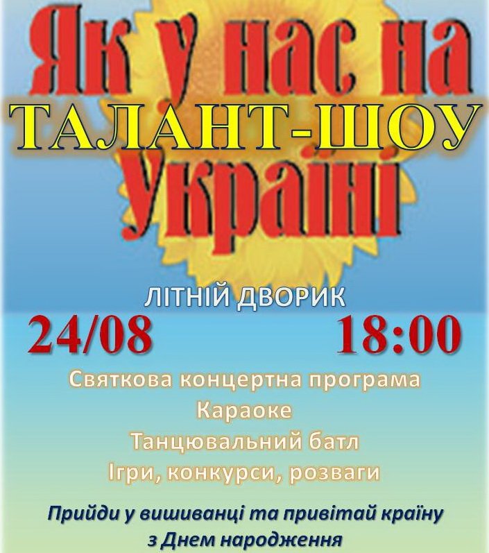 Для всіх вас підготовлена яскрава шоу-програма «Як у нас на Україні», де кожен зможе проявити свій талант, привітати Україну з днем народження та гарно провести дозвілля у чудовій компанії друзів, а ще насолодитися талантами кращих аматорів художньої самодіяльності міського палацу культури «Корабельний».