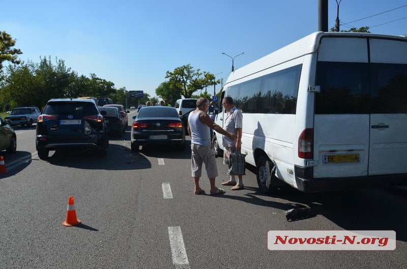 Утром в четверг, 13 сентября, на проспекте Богоявленском в Корабельном районе города Николаева столкнулись автомобили Toyota Rav 4, Chevrolet Aveo, Opel Kadett, Volkswagen Passat и микроавтобус Mercedes-Benz Sprinter, — сообщает Новости-Н.