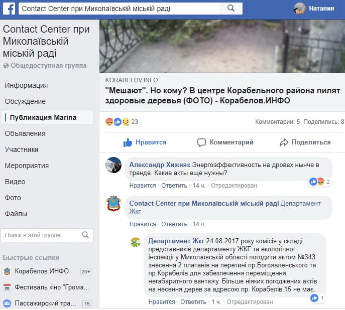 Отвечая по теме спиленных деревьев возле пересечения проспектов Корабелов и Богоявленского в Корабельном районе города Николаева, Департамент ЖКХ в группе «Contact Center при Миколаївській міській раді» отметил, что существуют акты, в которых согласован снос лишь двух деревьев по указанному адресу.