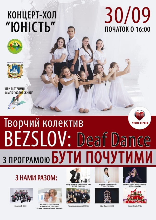 30 вересня о 16:00 у концерт-холі «Юність» у Миколаєві відбудеться благодійний концерт творчого колективу «Bezslov: Deaf Dance» з програмою «Бути почутими», приурочений Міжнародному дню глухих.
