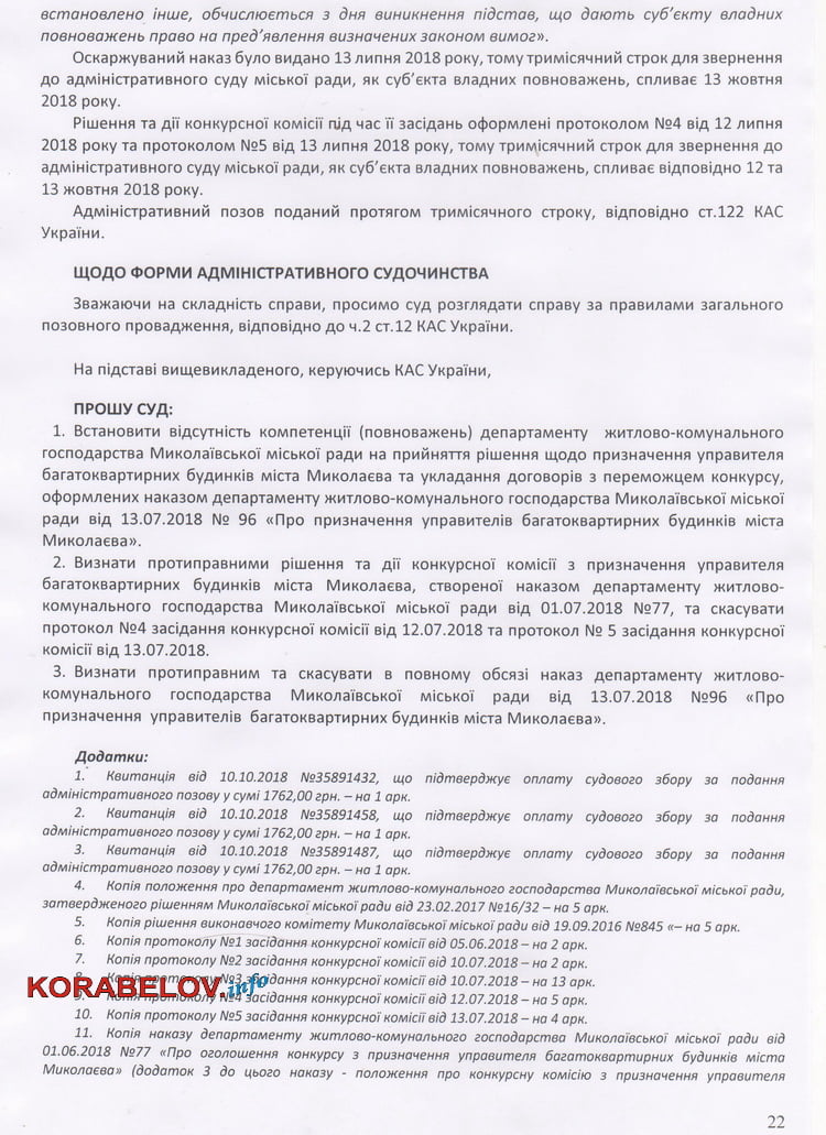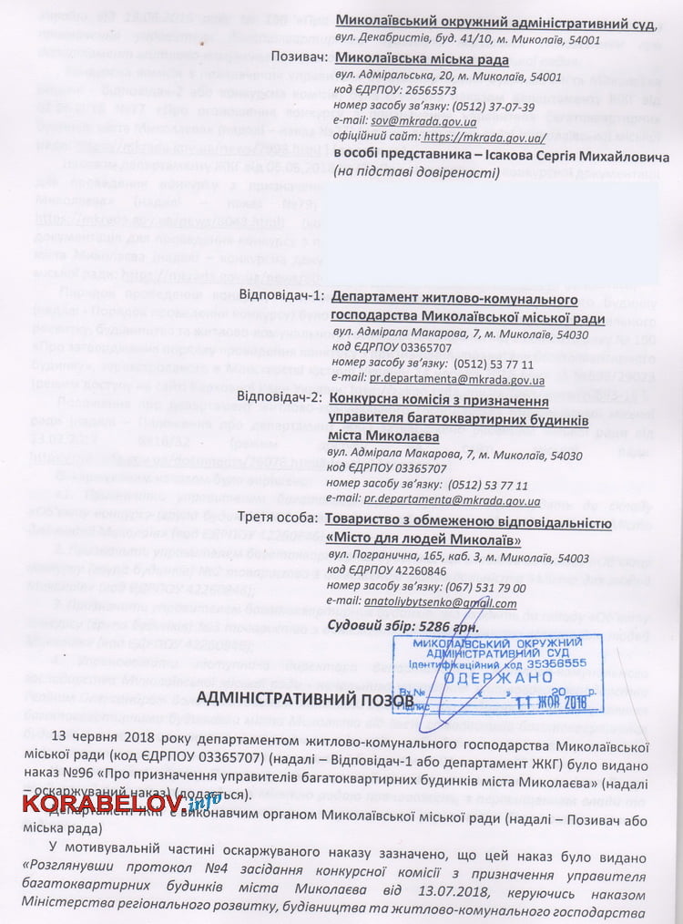 11 октября депутат Николаевского городского совета Сергей Исаков подал в Николаевский окружной административный суд Административный иск о признании противоправными решения и действий конкурсной комиссии по назначению управителя многоквартирных домов в городе Николаеве, созданной приказом департамента ЖКХ Николаевского горсовета.