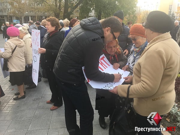 К ОГА люди сходились группами по несколько человек, а в руках у митингующих были плакаты с лозунгами: «23% — это не конец, МВФ требует 60%», «Москаленко, тебя выбирала не партия, а люди», а также «Это тупик, я не могу оплатить за тепло для своего ребенка».