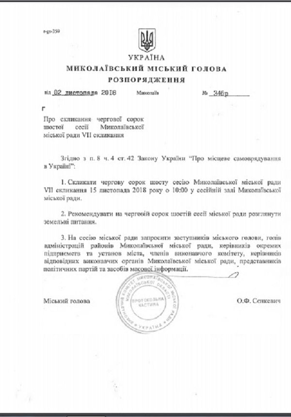 «На сессию городского совета пригласить заместителей городского головы, председателей администраций районов Николаевского городского совета, руководителей отдельных предприятий и учреждений города, членов исполнительного комитета, руководителей соответствующих исполнительных органов Николаевского городского совета, представителей политических партий и средств массовой информации», — сказано в распоряжении.