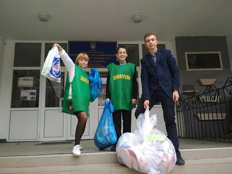 Учні шкільного екопатруля Миколаївської загальноосвітньої школи №1 імені Олега Ольжича, розташованої в Корабельному районі на одноіменній вулиці, сортують сміття в рамках проекту «Let’s do it, Ukraine».