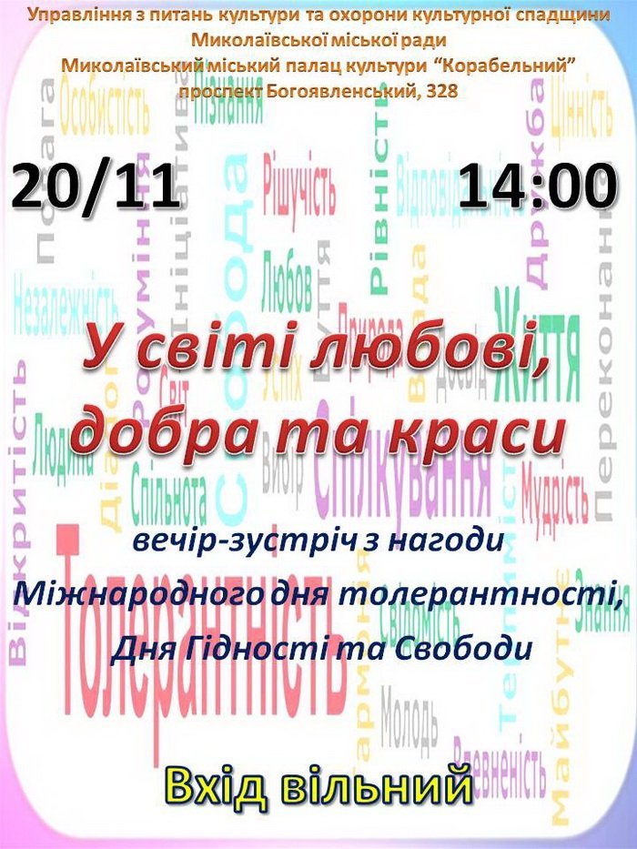 "У світі любові, добра та краси" пропонують побути гостям ПК "Корабельний" на зустрічі з нагоди Дня толерантності