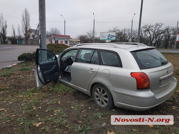 Днем в среду, 21 ноября, на так называемом «Жуковском» кольце в Корабельном районе города Николаева автомобиль Toyota Avensis выехал на клумбу и врезался в столб.
