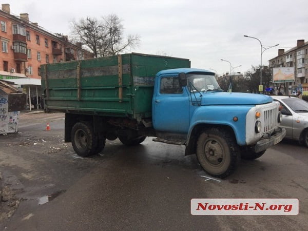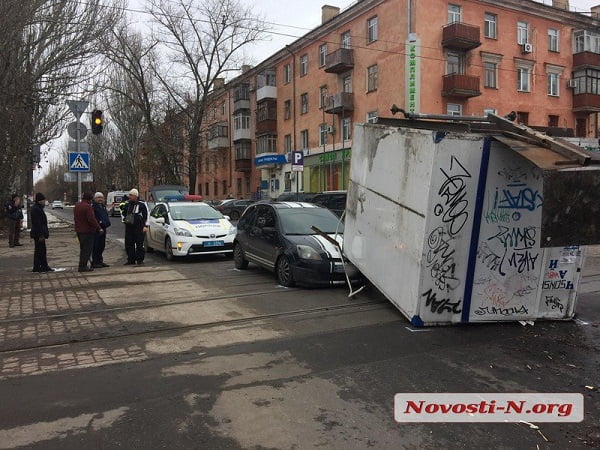 Утром в четверг, 6 декабря, на пересечении улицы Театральной и проспекта Богоявленского в Николаеве из грузового автомобиля ГАЗ выпал киоск, который транспортировал грузовик.