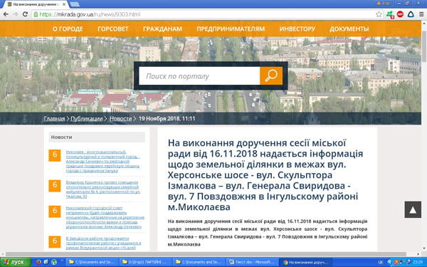 Але не все так просто. На офіційному сайті Миколаївської міської ради з’являється розпорядження під назвою: «На виконання доручення сесії міської ради від 16.11.2018 надається інформація щодо земельної ділянки в межах вул. Херсонське шосе — вул. Скульптора Ізмалкова – вул. Генерала Свиридова — вул. 7 Повздовжня в Інгульскому районі м.Миколаєва»