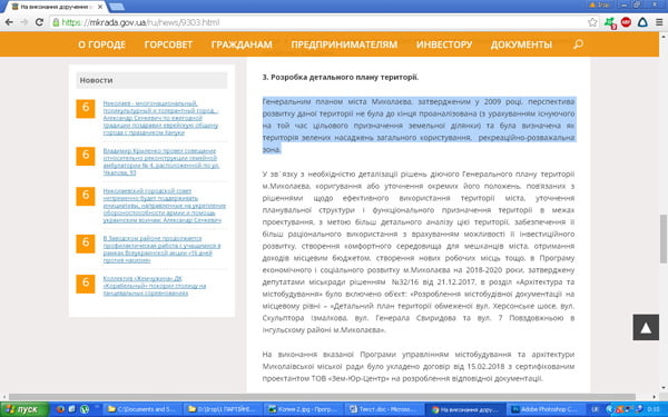 У Генеральному Плані забудови міста Миколаєва, прийнятому у 2009 році, ця ділянка визначена, як «ЗЕЛЕНІ НАСАДЖЕННЯ ЗАГАЛЬНОГО КОРИСТУВАННЯ» (на фото обведено та підкреслено):