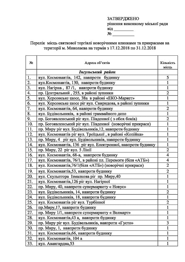 Данный проект решения утверждает перечень мест праздничной торговли новогодними елками и украшениями на территории Николаева на срок с 17 декабря по 31 декабря.