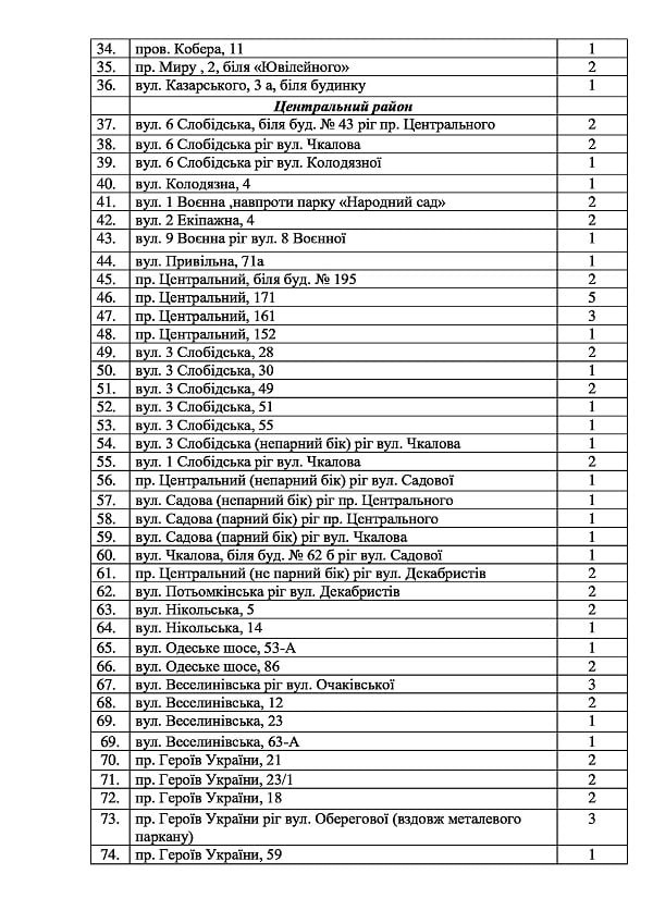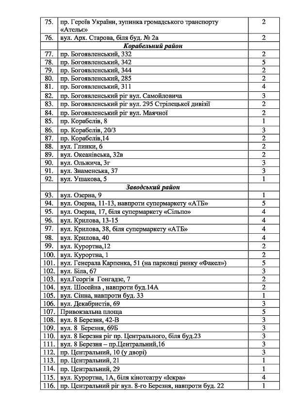 По словам директора департамента экономического развития Татьяны Шуличенко, Ингульская райадминистрация дополнила список еще тремя адресами: улица Космонавтов 60, проспект Богоявленский угол улицы Театральной, улица Космонавтов 136 угол улицы Театральной.