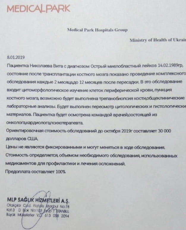 Клиника дала мне инвойс (счет) на обследования, он предположительный. Т.к. они точно не могут сказать, что и когда именно может понадобиться. Они дали среднюю оценку до октября 2019 года (будет год с момента пересадки), и счёт оказался 30 тыс. долларов. Это привело меня в шок. Это просто огромная сумма для обычной семьи из Украины. А учитывая то, что последние 7 лет мы боремся с моей болезнью — для нас она просто неподъемная.