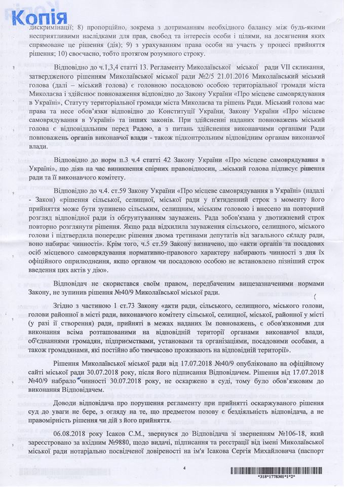 «Визнати протиправною бездіяльність Миколаївського міського голови Сєнкевича Олександра Федоровича щодо невиконання рішення Миколаївської міської ради від 17.07.2018 №40/9 в частині видачі Ісакову Сергію Михайловичу довіреності, якою міська рада уповноважила Ісакова Сергія Михайловича від її імені проводити визначені нею дії».