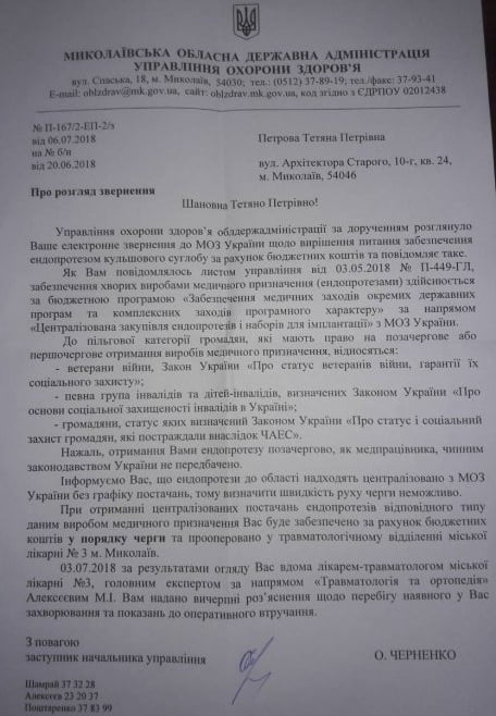 «Потрібна як найшвидше заміна двох тазобедреннх суглобів — вартість одного — 90 тысяч гривень. Після лікування раку в мене немає таких коштів. Дуже прошу у всіх допомоги. Мабуть, мені просто не дожити до того дня, коли мені зроблять хоч одну операцію (у порядку черги, як відповіли жінці в облздраві — прим. ред.). Дуже хочеться щє пожити. Дуже прошу, не дайте мені померти вдруге», — обращается Татьяна Петрова ко всем неравнодушным.