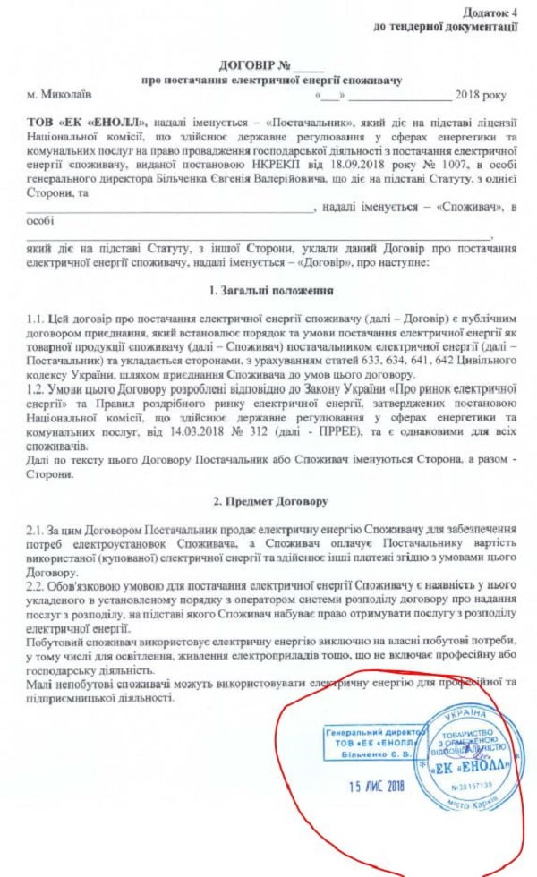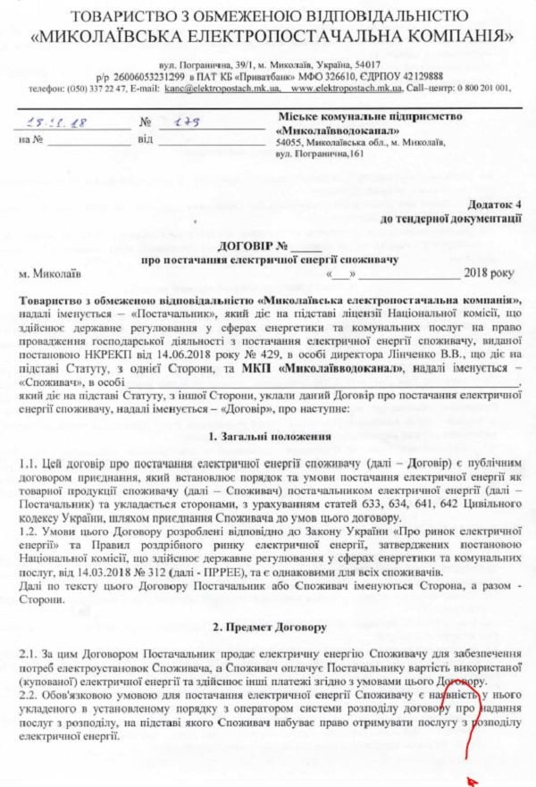 Указывается, что по тендеру «Николаевводоканала» сначала было три заявки. Но водоканал не допустил к аукциону «Николаевскую энергоснабжающую компании», которая поставляет педагогам более дешевую электроэнергию. Основанием для отклонения предложения стало то, что компания подала сканкопию проекта договора и бланков заявления-присоединения и коммерческого предложения с подписью уполномоченного лица и печатью только на последних страницах, тогда как тендерная документация требовала заверить ими все страницы. Победитель тендера предоставил этот документ с подписями и печатями на всех страницах.