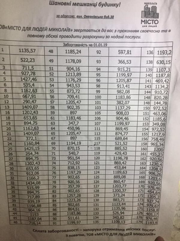 Из объявлений, развешанных на подъездах многоквартирных домов в Корабельном районе и содержащих просьбы УК «Місто для людей Миколаїв» оплатить их «надані послуги», следует, что местные жители не торопятся нести свои деньги «аферистам», коими считают данную управляющую компанию.