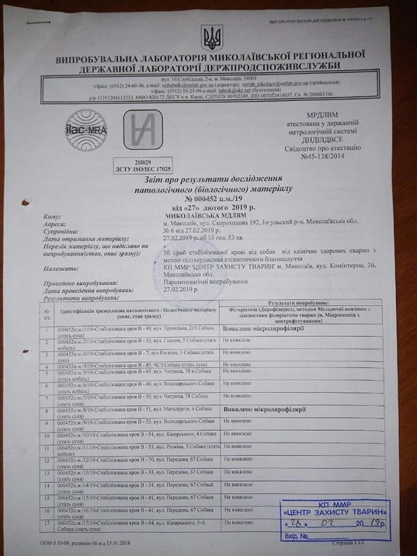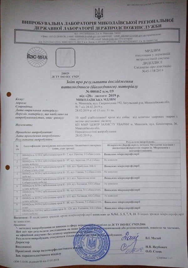 Коммунальное предприятие «Центр защиты животных» предоставило документы из государственной лаборатории Госпотребслужбы по итогам исследования крови бездомных животных, в которых указано, что у трети собак обнаружено заболевание «дирофиляриоз» (так называемый «сердечный глист»).