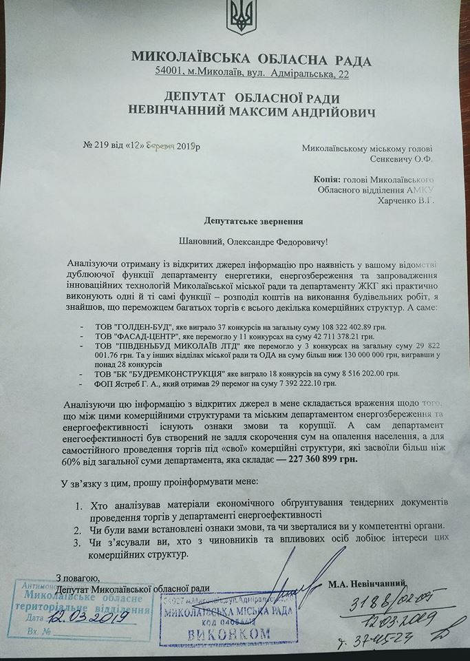 Максим Невенчанный сообщил, что обратился к городскому голове Александру Сенкевичу, а также в антимонопольный комитет с просьбой проверить деятельность департамента энергетики.