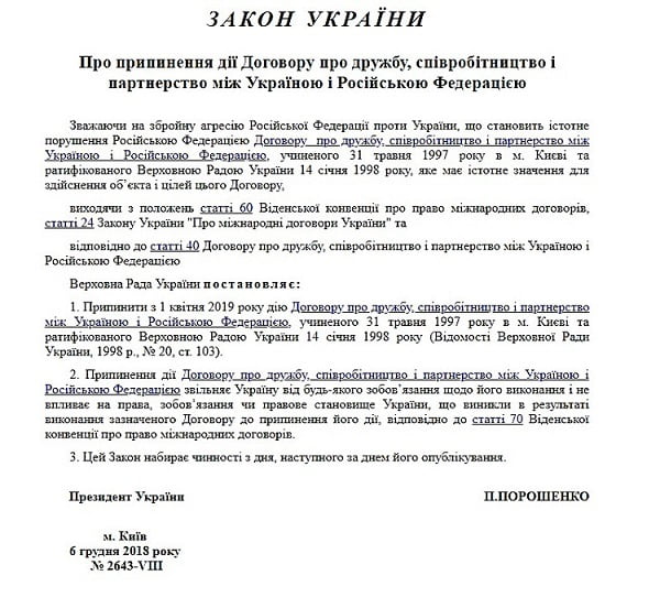 Учитывая вооруженную агрессию Российской Федерации против Украины, которая является нарушением этого договора, в декабре 2018 года был принят закон, который прекращает его действие.