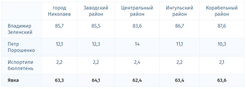 У Зеленского самая большая поддержка была в Корабельном районе Николаева – 87,6%, а наименьшая в Центральном – 83,6%.
