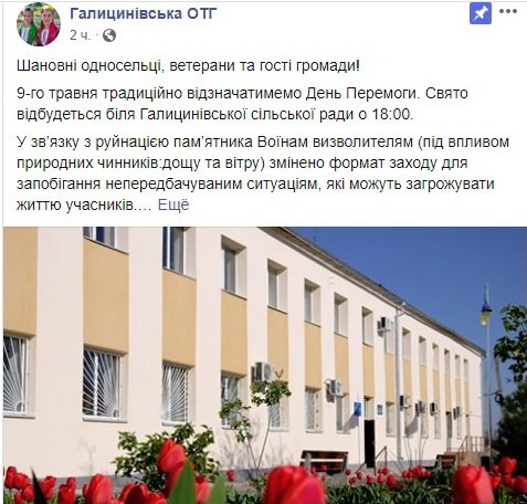 «Шановні односельці, ветерани та гості громади! 9-го травня традиційно відзначатимемо День Перемоги. Свято відбудеться біля Галицинівської сільської ради о 18:00. У зв’язку з руйнацією пам’ятника Воїнам визволителям (під впливом природних чинників: дощу та вітру) змінено формат заходу для запобігання непередбачуваним ситуаціям, які можуть загрожувати життю учасників. Монумент буде знято для реконструкції найближчим часом. Приносимо свої вибачення. Прохання розповсюджувати дану інформацію серед друзів на FB сторінках…», — говорится в сообщении чиновников.