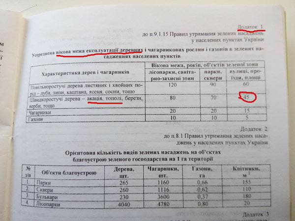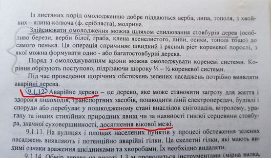Міська влада прямо порушує законодавство, а саме Наказ Міністерства будівництва, архітектури та ЖКГ України «Правила утримання зелених насаджень у населених пунктах України» (№ 105 від 1004.2006 р.). У п. 9.1.12 Наказу чітко сказано що таке аварійне дерево. І, що важливо окрім, всього вказується, що аварійність також наступає й в наслідок досягнення вікової межи. Це зазначається тому, що часто дерево виглядає живим та зеленим, а насправді вже наприклад коріння згнивши, під час буревію таке «зелене дерево» вивертається з землі. І тут ми підходимо до того, що ситуація з аварійністю просто ТОТАЛЬНА, в наслідок досягнення переважної більшості дерев на вулицях міста вікової межи. Так у Додатку 1 цього Наказу вказується що вікова межа тополь та акації на вулицях, проїздах, площах складає 45 років: