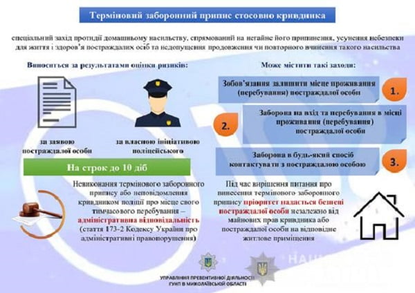 Слід зазначити, що терміновий заборонний припис стосовно кривдника застосовується з метою негайного припинення домашнього насильства, усунення небезпеки для життя і здоров’я постраждалих осіб та недопущення продовження чи повторного вчинення такого насильства.