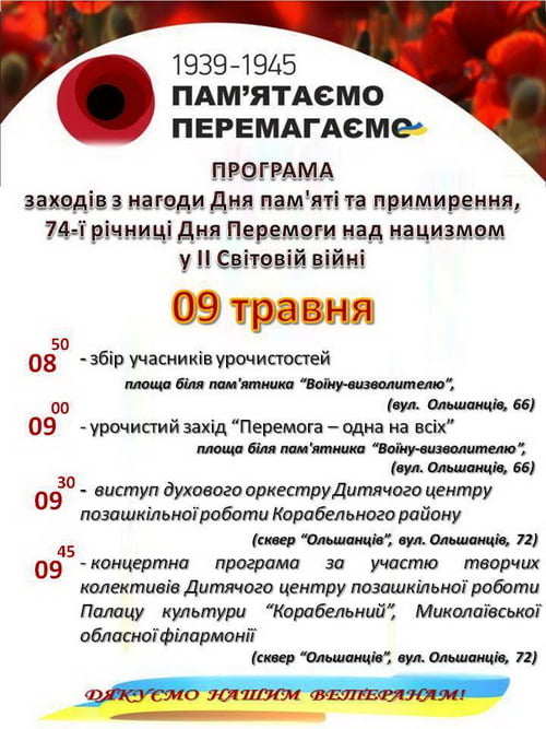 Шановні земляки! Дорогі жителі та гості Корабельного району міста Миколаєва! Адміністрація Корабельного району спільно з міським палацом культури «Корабельний» запрошують вас 9 травня 2019 р. на урочистий захід «Перемога – одна на всіх» до пам’ятника «Воїну-визволителю» (вул. Ольшанців, 66) з нагоди відзначення Дня пам’яті та примирення і 74-ї річниці Дня перемоги над нацизмом у Другій світовій війні.