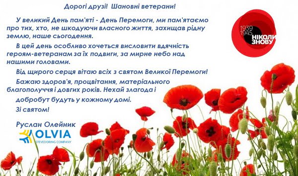 Від щирого серця вітаю всіх з святом Великої Перемоги! Бажаю здоров’я, процвітання, матеріального благополуччя і довгих років. Нехай злагода і добробут будуть у кожному домі…»